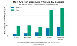 Based on the NVDRS 2016 data, The New York Times acknowledged that, among men, those over 65—who make up a smaller proportion of the population—are at greatest risk of death by suicide.[48] The NVDRS 2015 data showed that, among men of all races, men over 65 were the most likely to die of suicides (27.67 suicides per 100,000), closely followed by men 40–64 (27.10 suicides per 100,000). Men 20–39 (23.41 per 100,000) and 15–19 (13.81 per 100,000) were less likely to die of suicides.[49]