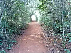 The 90-minute Sumidouro trail starts at the Casa Fernão Dias and passes through the historical landmark "Cruz do Pai Mané". It leads to the Sumidouro lagoon gazebo, which gives a view of the surrounding region, and then to the Gruta do Sumidouro (Sumidouro Cave), which has cave paintings thousands of years old.[2] The Gruta do Sumidouro is where Peter Lund found human bones mingled with bones of extinct megafauna, and removed about 30 skulls of "Lagoa Santa Man".[1] The trail returns to the Casa Fernão Dias along the edge of the Sumidouro lake. The trail is medium difficult and must be scheduled in advance.[2]