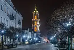 • The city centre is dominated by the large cathedral of the Saviour's Transfiguration. It is a neoclassical structure of the 18th century, extensively repaired and reconstructed in 1858 and in the 1880s when the 56-metre-high bell tower (180 ft) was added. The interior features frescoes by Vladimir Makovsky and Klavdiy Lebedev.