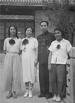 Sun Weishi had three siblings, one sister and two brothers. One of Sun Weishi's brothers, Sun Yang, was imprisoned with his father in 1927, when he was only twelve. Sun Yang was eventually released, became Zhu De's personal assistant, and became the president of Renmin University after the founding of the People's Republic of China.[2] In 1967 Jiang Qing accused Sun Yang of being a spy for the Soviet Union, the Japanese, and the Kuomintang, and Sun Yang was tortured and killed by Maoist Red Guards in the basement of his own university.[5] Sun Weishi's other brother, Sun Mingshi, died in combat fighting for the CCP against the KMT. Sun's sister, Sun Xingshi, taught at the Foreign Languages Department at Peking University. In 1975, Sun Xingshi married Sun Weishi's widower, Jin Shan, who had been imprisoned throughout the Cultural Revolution for his association with Sun Weishi.[2]