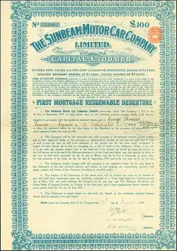 Debenture of the Sunbeam Motor Car Company Ltd., issued 26. August 1919