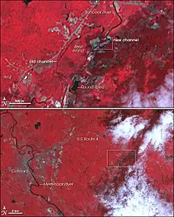 On May 16, 2006, the Suncook River, responding to the highest rainfall amounts in at least 70 years (more than 8 inches (200 mm) dropped by a low-pressure system in three days on Concord, New Hampshire), rose to flood level and backed up behind an old mill dam, which produced a shallowly-sloping pool that overtopped a sand and gravel quarry, connected with a downstream section of channel, and cut a new shorter channel at 25–50 meters per hour in the town of Epsom.[2] Two previous channels, around Bear Island, were left dry. The new river course, approximately a mile long, is the largest channel change in a river in New Hampshire since systematic topographic mapping began in the state in the early 20th century.[3]
