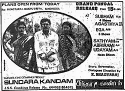 Sundara Kandam (transl.The Beautiful Chapter) is 1992 Indian Tamil-language romantic comedy film, written and directed by K. Bhagyaraj, and produced by his wife Poornima. The film stars Bhagyaraj, Bhanupriya and Sindhuja. It revolves around a student (Sindhuja) who loves her teacher (Bhagyaraj), but he does not reciprocate.
