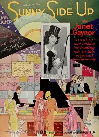 Sunny Side Up (stylized on-screen as Sunnyside Up) is a 1929 American sound (All-Talking) pre-Code Fox Movietone musical film starring Janet Gaynor and Charles Farrell, with original songs, story, and dialogue by B. G. DeSylva, Lew Brown and Ray Henderson. The film features a color sequences in the Multicolor process. The romantic comedy/musical premiered on October 3, 1929, at the Gaiety Theatre in New York City.[2] The film was directed by David Butler and has a running time of 121 minutes.