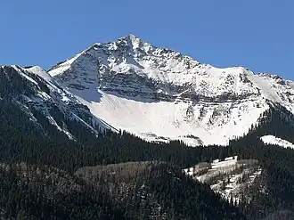 Sunshine Mountain is a 12,930-foot-elevation (3,940-meter) mountain summit located in San Miguel County, in Colorado, United States.[3] It is situated nine miles southwest of the community of Telluride, in the Lizard Head Wilderness, on land managed by Uncompahgre National Forest. It is part of the San Juan Mountains which is a subset of the Rocky Mountains. Sunshine Mountain is situated 24 miles west of the Continental Divide, 2.75 miles east of Wilson Peak, and 1.8 mile northeast of Lizard Head, the nearest higher neighbor.[1] Topographic relief is significant as the west aspect rises 2,700 feet (820 meters) above Bilk Creek in approximately one mile. The mountain is composed of rock of the San Juan Formation overlaying Telluride Conglomerate, in turn overlaying Mancos Shale.[4] The mountain's name, which has been officially adopted by the United States Board on Geographic Names, was in use before 1899 when Henry Gannett published it in A Dictionary of Altitudes in the United States.[5]