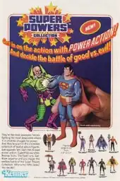In 1984, DC Comics awarded the master toy license of their characters to Kenner Products, hot on the heels of Mattel's "action feature" heavy Masters of the Universe toy line. The initial pitch seemed to be heavily influenced by Kenner's popular Star Wars toyline with multiple playsets dedicated to individual franchises like Superman, Batman, Wonder Woman, Green Lantern, Teen Titans, Lois Lane, and the Super Jrs.[1] Winning the license away from Knickerbocker and Mattel in 1982 with an emphasis on action and art, Kenner devised hidden mechanisms within the figures that would trigger an action when the figure's legs or arms were squeezed. This emphasis on each figure's "super power" led to the naming of the line: "The Super Powers Collection". Each figure in the first two series were also packaged with a mini-comic featuring an adventure with a spotlight on that character. The figures also included a cut-out collector's card on the back of each package.