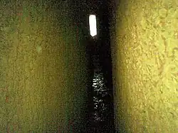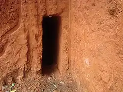 Once the flow is detected, the digging of the surangas is carried out by manual labourers or by the villages themselves with the help of improvised digging tools like pick axes and wedges.[5] The digging takes places mainly during the dry season, in between February and May, to prevent collapsing of wall due to presence of moisture in the soil.[8] The tunnels are generally rectangular or dome-shaped with an optimal height and width which allows a man to work and pass comfortably.[1]: 662  The tunnels are made with a downward slope to use the gravitational force for collection of the water percolating outside.[9] During construction, lining of walls is provided to prevent collapsing of wall due to loose or soft soil.[1]: 662  While an average suranga is 26 metres (85 ft) meters deep,[1]: 662  surangas up to 250 metres (820 ft) meters deep have also been recorded.[10] Air shafts are constructed in longer surangas to supply fresh air and to expel poisonous gases.[1]: 662