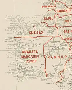 It was established on 24 January 1871, adopting the historic name of the Busselton region, in honour of Prince Augustus Frederick, Duke of Sussex. Its original boundaries included the town of Busselton and extended as far as Augusta, Dunsborough, Forest Grove, Jarrahwood and Margaret River.[1][2] However, a month later, on 21 February 1871, the Municipality of Busselton was proclaimed, separating the town of Busselton from the road district which surrounded it, with the boundary being West Street and Ford Road.[1][3] The first election for the Sussex Road Board was held on 25 February 1871.[2]