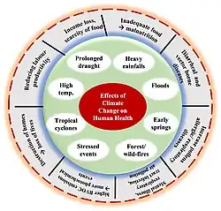 Threats to human health vary from direct injury following extreme weather events, exacerbation of respiratory disease due to air pollution, change in the distribution of vector borne disease, increase likelihood of zoonotic diseases, malnutrition following crop failures, negative impact on mental health, heat related illness and many more.[5]