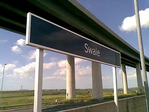 Swale is a single platform station with one curving platform. It is immediately adjacent to the A249 road which is on a flyover above the station before it crosses The Swale on the Sheppey Crossing. The station is named after The Swale, the channel which separates the Isle of Sheppey from the mainland and connects with the River Medway to the west and Thames Estuary to the west. North of the station, the railway line crosses the channel on the Kingsferry Bridge. Ridham Dock lies 1 mile (1.6 km) south-east of the station.