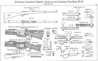 The Swiss Mannlicher Model 1893 carbine was a straight-pull carbine designed by Ferdinand Mannlicher for use by the Swiss cavalry troops.[1] It features a bolt that is almost identical to that of the Mannlicher M1890 carbine and Mannlicher M1895 rifle aside from the shape of the cocking piece.