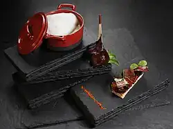 Swiss cuisine comprises a variety of staple foods. These typically include bread, potatoes, pasta, rice and polenta. Potatoes are particularly ubiquitous in Swiss cuisine, although it is only the case since the late 18th century.[5] They are notably used in rösti, a popular dish that is eaten all over Switzerland, and originally a breakfast food.[6]Bread and cereals are eaten on a daily basis in Switzerland. Muesli, which is commonly eaten for breakfast, goes by the name of "Birchermüesli" ("Birchermiesli" in some regions). For breakfast, most Swiss enjoy sliced bread with butter and jam; bread also accompanies most meals. There is a wide variety of breads made in Switzerland, from pain de seigle to Zopf. Tarts and quiches are also traditional Swiss dishes. Tarts in particular are made with all sorts of toppings, from sweet apple to onion.[7]