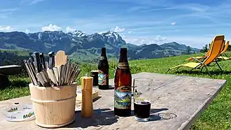 Beer is second to wine in terms of consumption among Swiss.[43] The country has a long tradition of brewing, with significant domestic beer production and a growing craft brewing sector.[44][45] Most contemporary large-scale breweries are in German-speaking Switzerland. The Feldschlösschen brewery in Rheinfelden dwarfs all others in the country in terms of output. Calanda brewery in Chur is the largest in Graubünden. Zürich hosts the country's largest beer festival annually, and has a number of microbreweries.[46][47]