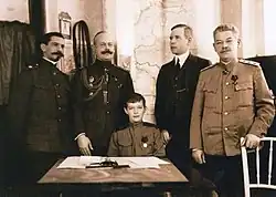 (Left to right) Pierre Gilliard, Major General Voyeikov, Tsarevich Alexis, Sydney Gibbes, Pyotr Vassilievich Petrov, c. 1916