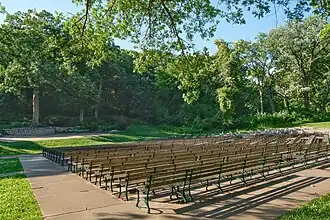 Outdoor locations for pageants and festivals grew in popularity on college campuses in the United States during the 1910s and 1920s. An outdoor amphitheater was also built in Forest Park in St. Louis, Missouri during this same time. The plan for a sylvan theater in Des Moines was derived from plans prepared by city planners from St. Louis: Harland Bartholomew Associates. They created a comprehensive plan for the city's park system in 1927.[2] The Des Moines Garden Club had C.A Baughman from the same firm draw up detailed plans for Greenwood Park. Included in the new land uses for the park were the plans for a sylvan theater on the eastern edge of the park. It was modeled after the theater in Forest Park.