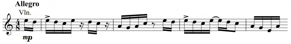 The stormy main theme of the final movement is in E minor and uses the whole orchestra. The movement is written in a loose rondo form, with repetitions of the main theme broken up by calmer passages with reduced orchestration and texture.[14] The movement builds to a frantic prestissimo coda which brings the work to a dramatic close.