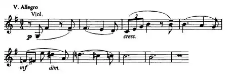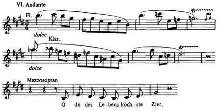 The finale is a paean to the sovereignty of Art, a theme common in Scriabin's works. The words were written by Scriabin himself. The mezzo-soprano begins the movement with "O highest symbol of divinity, supreme art and harmony, we bring praise as tribute before you", and the piece concludes with mezzo-soprano, tenor and—finally—the chorus singing "Ruling omnipotently over the earth, you lift man up to do glorious deeds. Come all peoples everywhere to Art. Let us sing its praises."[2][3]