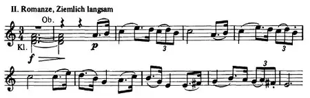 The scherzo borrows a theme from Symphony No. 1 in F minor, Op. 7 (1824) by Johann Wenzel Kalliwoda (1801–1866), whom Schumann admired.[6] Schumann may also have borrowed a melody that appears in the first and fourth movements from the continuous string accompaniment for "Siehe! wir preisen selig" ("Happy and blest are they"), the final chorus in scene one of Felix Mendelssohn's oratorio "St. Paul," a work which Schumann praised in a letter dated March 2, 1839.[7]