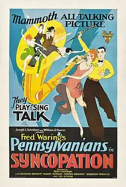 Syncopation is a 1929 American pre-Code musical film directed by Bert Glennon and starring Barbara Bennett, Bobby Watson, and Ian Hunter (although top billing went to Fred Waring and his Pennsylvanians). It was the second film produced by RKO Radio Pictures and the first to be released by the studio, in March 1929;[3] the company's first produced film, Street Girl, was not released until August 21, 1929. The film was made at the company's New York City studios[4] and is based on the novel Stepping High by Gene Markey. The film was heavily marketed on its release, being the first film to be broadcast over the radio, and was a significant success.[5]