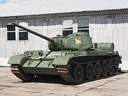 The T-44 was a medium tank developed and produced near the end of World War II by the Soviet Union. It was the successor to the T-34, offering an improved ride and cross-country performance, along with much greater armor. Designed to be equipped with an 85 mm main gun, by the time it was fully tested the T-34 had also moved to this weapon. Both tanks offered similar performance, so introducing the T-44 was not considered as important as increasing T-34 production. Fewer than 2,000 T-44s were built, compared to about 58,000 T-34s. Although the T-44 was available by the end of the war, it was not used in any battle. It was 1 ton lighter than the T-34-85 and slightly faster. The T-44 was heavily influential on the design of the T-54/55 Medium tank, most prominently lower hull and turret profiles. Also notable was the T-44-100, a 100mm D-10T-armed prototype, which would be the same 100mm gun mounted on the T-54/55, bar some minor changes.