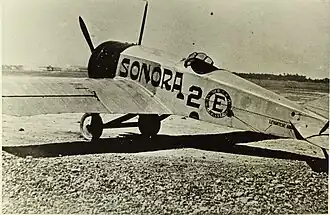 The first aircraft of the Serie E family was a low-wing monoplane with registration number 2-E-98, which was dubbed "Sonora", this airplane made its first flight on March 2, 1922. It was powered by an 82 kW (110 hp) le Rhône 9J 9-cylinder rotary engine, exceeding expectations, with performance significantly higher than similar aircraft at the time. Despite its benefits, the plane was not produced in series, because for was the Technical Consultant of the Aviation Department Ralph O'Neill, the aircraft could not be used for military purposes.[1] The "Sonora" was in service with the Mexican Air Force until 1925 and later dismantled, being sold to a private individual.[2]