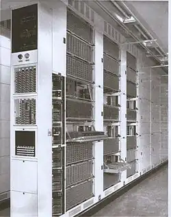 The choice of the main type of memory used in the TXE2 (and the TXE4) was particularly characteristic of the general design philosophy, that the components used had to be of a technology that had been tested over many years. The choice thus went to the Dimond ring type of memory, named after T. L. Dimond of Bell Laboratories, who invented in 1945.[2] They were large-diameter magnetic ferrite toroidal rings with solenoid windings, through which are threaded writing and reading wires. These racks gave the ability to convert a subscriber's directory number into an equipment location identity. This was a considerable innovation in British exchanges since in Strowger exchanges the directory and equipment numbers had to be the same.