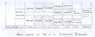 The TXE6 consisted of two parts: a unit for receiving digits at 10 pulses per second (p.p.s.), followed by a two-stage cross-point-switch. The 10 p.p.s. unit was the interface, converting information from dialled pulses, in Strowger form, to fast parallel signal conditions for the reed group-selector registers. The 10 p.p.s. unit was equipped with four controls, and on each there were 96 access circuits, making a total input of 384 junctions. The intermediate switching unit also had four controls, each of which was divided into two parts. Each part controlled a switching unit of 48 inlets and 200 outlets arranged over 10 levels. This gave a total of 1,600 outlets over the ten levels or 160 trunks per level. The outlets were graded over the four controls. A feature of the TXE6 unit was that two equipment levels could be combined to give an availability of 40 trunks from any one level. This facility was used at Leighton Buzzard.