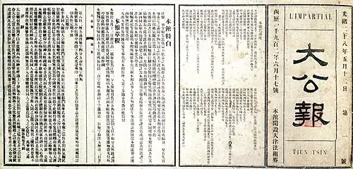 Ta Kung Pao (simplified Chinese: 大公报; traditional Chinese: 大公報; French: L'Impartial[1]: 7 [2]) was one of the most influential newspapers of the Republic of China until 1949.[3][4]: 98