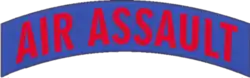 The Airborne tab is a part of the SSI of certain airborne and air assault units. Airborne and air assault forces are military units, usually light infantry, set up to be moved by aircraft and dropped into battle. Thus, they can be placed behind enemy lines and have an ability to deploy almost anywhere with little warning. The tab is worn immediately above and touching the SSI. The tabs are 2+1⁄2 inches (6.4 cm) long and 11⁄16 inch (1.7 cm) wide. The letters are 5⁄16 inch (0.79 cm) high.[1][2][29]