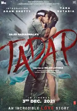 Tadap (transl. Yearning) is a 2021 Indian Hindi-language romantic action thriller film directed by Milan Luthria and produced by Sajid Nadiadwala under the Nadiadwala Grandson Entertainment banner, with Fox Star Studios serving as distributor and co-producer.[6] A remake of the Telugu film RX 100 (2018), the film stars debutant Ahan Shetty and Tara Sutaria.[7] The film released theatrically on 3 December 2021 to mixed reviews with praise towards its music, performances and action sequences but criticism towards screenplay and dialogues.