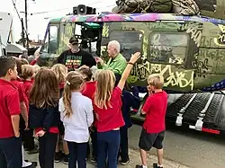 Take Me Home Huey is an art project[1] and sculpture that was manifested from a discarded U.S. Army Bell UH-1 Iroquois helicopter, that served as an air ambulance for the U.S. Army in the Vietnam War. The serial number is 67-17174, commonly known as #174. Artist Steve Maloney created the concept and artwork using the restored helicopter's 47-foot long fuselage as a canvas. The composition includes a mule pack of soldier's duffels, public address speakers and a vinyl wrap of Vietnam Helicopter Squadron names, along with symbolic 1960's and 70's pop culture imagery of icons that many soldiers longed for. The cockpit contains a time capsule of original veteran's artifacts, along with the abstract suspension of miscellaneous helicopter parts and instruments that were part of the original aircraft.[2]