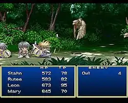 The game uses an enhanced version of the Linear Motion Battle System that debuted in the first game of the series, Tales of Phantasia. Battles take place on a 2-D plane where characters and enemies act in real time. Melee and ranged attacks are executed in real time, with spell casting requiring a chanting time that increases directly with the complexity of the spell being cast. When the chanting of a spell is complete, game-time temporarily stops as the spell animation is carried out and damage is assigned, so spells essentially pause the battle when cast. Special melee and ranged attacks do more damage or have more hits than normal attacks, but require technical points, or TP, to be consumed for use. Also, the battle system rewards the player with extra experience for stringing together multi-hit combos. The end result of this break from turn-based RPG battle systems is a more fast-paced and reaction-oriented system that behaves more like a side-scrolling action game.[5]