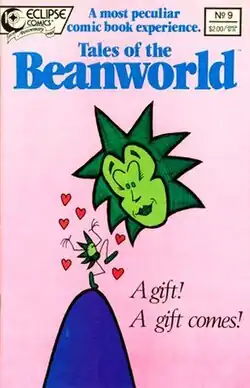 With Marder's permission, lead character Beanish appeared in Eclipse's 1988-1989 crossover limited series Total Eclipse.[3] His appearances, drawn by Marder and seeing the character interact with the likes of Miracleman and Aztec Ace, were one of the few aspects of the series to draw positive reception.[4][5] It had initially be planned that he would only make a cameo appearance, but at Marder's suggestion Beanish's role was expanded.[6] It was also one of the few Eclipse titles to acknowledge the crossover's impact, with Beanish being absent from Tales of the Beanworld #10-11 as a result.[7]