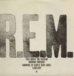 "Talk About the Passion" is a song by the American alternative rock band R.E.M., released as the second single released from its debut album Murmur in 1983. It was released in Europe only, on 12" vinyl. This song failed to follow up on the success of "Radio Free Europe" released earlier in the year, as it did not chart. A live performance at Larry's Hideaway, Toronto, Canada, from July 9, 1983, was released on the 2008 Deluxe Edition reissue of Murmur.
