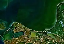 The Taman Bay (Russian: Таманский залив) is a shallow bay or gulf on the east coast of the Strait of Kerch shaped on the southern side by the Tuzla Spit and to the north by the Chushka Spit. It dips into the Taman Peninsula of Krasnodar Krai, Russia for about 16 km. The bay is 8 km wide at its mouth and is up to 5 metres deep. Fishing villages and the old townlet of Taman afford fine views of the bay.