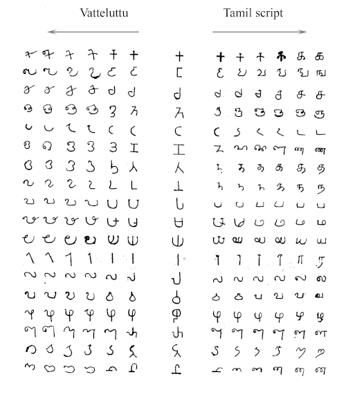 Diverging evolution of Tamil-Brahmi script (center column) into the Vatteluttu alphabet (leftmost column) and the Tamil script (rightmost column)