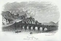 During the Middle Ages, the settlement then known as Llanteulyddog ('St Teulyddog's)[10] accounted one of the seven principal sees (Cantrefi) in Dyfed.[11] The strategic importance of Carmarthen caused the Norman William fitz Baldwin to build a castle there, probably about 1094. The current castle site is known to have been occupied since 1105. The castle itself was destroyed by Llywelyn the Great in 1215, but rebuilt in 1223, when permission was given for a town wall and crenellations, making it one of the first medieval walled towns in Wales. In 1405, the town was captured and the castle sacked by Owain Glyndŵr. The Black Book of Carmarthen of about 1250 is associated with the town's Priory of SS John the Evangelist and Teulyddog.