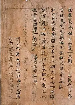 Tao's preface explains that beginning in the Wei-Jin period, copies of the Shennong bencao jing text had become corrupted, and contemporary medical practitioners "are not able to clearly comprehend information and as a result their knowledge has become shallow".[26] He further explains that his commentary combines previous material from the Shengnong bencao jing (which Tao refers to as Benjing) and other early pharmacological sources, material from his Mingyi bielu (名醫別錄, "Supplementary Records of Famous Physicians"), and information gathered from alchemical texts, notably what he calls xianjing (仙經, "classics on immortality elixirs") and daoshu (道書, "books on Daoist techniques"). While the early pharmacopeia had only graded substances into superior, medium and inferior, Tao rearranged them into a classification that continues to be used today: minerals, trees and plants, insects and animals, fruits, cultivated vegetables, and grains. For each substance in the Bencao jing jizhu, Tao gives information on the availability, sources, alternative nomenclature, appearance, similarities and confusions, suitability for medicinal usage, effectiveness, quotations from classical and other sources, and errors in existing texts.[27] Tao is considered "the effective founder of critical pharmacology in China", and his editions and commentaries were "painstaking productions, using, for example, different colored inks to distinguish text, original annotations, and his own editorial additions".[28]