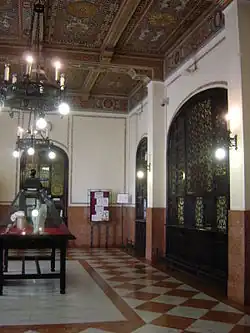 The internal rooms are furnished with dark wooden furniture in Sicilian style from the late nineteenth century. The walls and ceilings of the station's rooms are embellished with frescoes and relief decorations by Salvatore Gregorietti from Palermo, he also took care of the creation of stained glass windows and wrought iron furnishings.[6]