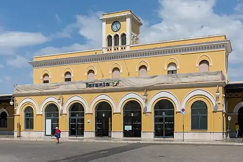 Taranto railway station (Italian: Stazione di Taranto) is the main station serving the city and comune of Taranto, in the region of Apulia, southern Italy. Opened in 1868, it forms a junction between three main lines, from Bari, Brindisi and Reggio di Calabria, respectively. It is also a terminus of a secondary line, the Bari–Martina Franca–Taranto railway.