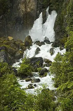 The Tarawera River flows out of Lake Tarawera and across a rhyolitic lava flow that erupted from Mt Tarawera about 14,000 years ago. The river disappears about 30 metres (98 feet) back from the clifftop into flooded caves in the lava and pours out halfway up the cliff on the far side of the flow.[2][3]