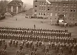 At the onset of World War II in September 1939, Poland was invaded by Germany and Nazi German occupation began. On September 6–8, 1939, the Einsatzgruppe II entered the town to commit various crimes against Poles.[15] Mass searches of Polish organizations, offices and houses,[16] and mass arrests of priests, teachers, intelligentsia and fighters of three anti-German, Silesian Uprisings (1919–1921) took place. The synagogue was burned while German minority enthusiastically welcomed invading Nazi forces. Already by September 1939, the Germans had murdered over 20 Poles in the present-day districts of Lasowice, Strzybnica and Repty Śląskie.[17] Among the victims were miners, former insurgents and a school principal from nearby Chorzów.[17] Germany established and operated a prison for Poles in the town.[18] During the occupation, the Armia Krajowa (Home Army, the leading Polish underground resistance organization) undertook a sabotage campaign against Nazi forces, railroad-transport and local industry. The Germans operated two forced labour subcamps of the Stalag VIII-B/344 prisoner-of-war camp in the town.[19] Liberation of Silesia came in early 1945; in order to save the industrial infrastructure of the region, the Red Army opened an offensive supported by massive numbers of troops with minimal use of heavy artillery and air-bombardment. According to witnesses, the entire operation was extremely fast; countless, shoulder-to-shoulder, crowds of Russian soldiers passed through the town in matter of minutes followed by almost complete still.
