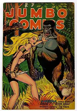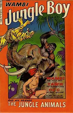 Fiction House released a few characters of Indian origin like Wambi the Jungle Boy, released in Jungle Comics #1 in January 1940). Co-created by Henry Kiefer, Wambi lived in a jungle that mixed elements of African and Indian jungles, and in addition to Jungle Comics, Wambi was published in his own comic book .[52] As female examples, there is Taj of the Elephants, an anonymously created character released in Jungle Comics #57 (1944)[53][54][55] and Jan of the Jungle, co-created by Enrico Bagnoli and released in Rangers Comics #42 (August 1948).[56] In Buster Brown Comics #11 (1948), the character Ghanga was released, later spelled Gunga.[57] In addition, the Indian-American actor Sabu Dastagir played two characters created by Rudyard Kipling: Toomai in Elephant Boy (1937) and Mowgli in Jungle Book (1942),[58] as well as becoming a comic book character inspired by these roles: Sabu, Elephant Boy, published in Red Circle Comics #4 (April 1945)[59] and a two-issue comic book of his own with stories illustrated by Wally Wood and published by Fox Feature Syndicate.[60] In 1946, in the pages of the French comic book Fillette, the heroine Durga Râni appeared, written by René Thévenin and illustrated by René Pellos.[61]