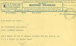 He was the guest of honour at a formal dinner held by Curtin in Perth and dined privately with the Curtins many times. He was also a guest at The Lodge after Curtin became Prime Minister, and at the opening of the Australian War Memorial in Canberra on 11 November 1941. He sent a telegram to Curtin expressing his sympathy at the loss of HMAS Sydney on 1 December 1941, only days before Australia declared war on Japan. Some authors believe that the telegram was sent on 27 November 1941, based on the number "27" that appears in the first line of typed text. This appears not to be correct. The entry "X 15 SYDNEY" identifies the Office of Origin, the numeral "27" the number of words used (H M A S amounting to four words), and the entry "11-57 AM" is the time the telegram was lodged. These entries coincide with the headings above them.
