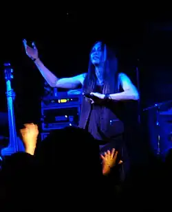 Tatsuro described his voice as "atypical", which makes it stand out and easy to recognize.[5] Although he has taken vocal lessons in the past, he stopped as he did not understand the "abstract" things the instructor would say. "The best teacher I have now is my experience in the field. With trials and errors I have come to understand the fundamentals of singing such as breathing, posture, placement of voice, endurance and so on."[5] When an interviewer suggested a singer must be thinking about the lyrics while performing, Tatsuro dismissed the notion and stated that singing was like riding a bicycle.[7] He also said that he prefers to sing, and does not like screaming because it is tiring.[41] Like the other members of Mucc, Tatsuro often performs barefoot.[42] He said he got the idea after seeing Cocco's April 20, 2001 performance on Music Station, where the barefooted singer abruptly left the studio after finishing her song.[41] He further explained that this was in Mucc's indie days when they had no money; whenever they were putting together new costumes, the shoes were typically the most expensive part, but as a visual kei band they could not simply wear sneakers.[41] Nightmare vocalist Yomi said that he performed barefoot when he was an indie artist due to Tatsuro's influence.[41]