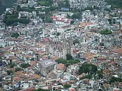 Before the arrival of the Spanish in Mexico, the indigenous community known as "Taxco" was not located where the modern city is now. The name referred to a village about ten kilometers to the south, which is now referred to as Taxco El Viejo (Old Taxco). In pre-Hispanic times, this village was the most important in the area as it was the seat of the Aztec governor who presided over tribute collection in the surrounding seven districts.[2] The modern Spanish town of Taxco was founded by Hernán Cortés in an area previously known as Tetelcingo, because of the abundance of silver here.[2][3]