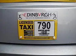 British taxi medallion from Edinburgh, United Kingdom, affixed to the rear bumper of a car.