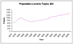Major industrial development began in 1957, when Westcoast Energy (later Duke Energy) built the province's first gas processing plant, as well as a refinery and pipeline to Kamloops.[5] The community that formed around this industrial development was incorporated as a village on August 23, 1958, and soon after Canfor opened a planer mill. Meanwhile, 120 km (75 mi) upstream, the W.A.C. Bennett Dam was completed in 1966 and the Peace Canyon Dam in 1980, which controlled the level and flow of the Peace River, making navigation and flood control much easier. The 1961 Canadian census, the first to recognize Taylor as a census subdivision, counted 438 people.[6] During the subsequent five years the population rose 36% to 595 people but rose only a further 2% to 605 people by 1971.[6]