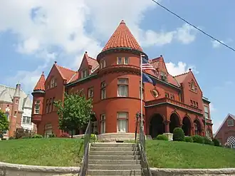 The Taylor-Zent House, also known as Hart Funeral Home, is a historic home located at 715 Jefferson Street in Huntington, Indiana, USA. The house is an excellent example of the Romanesque Revival style of architecture. It was built in 1896-98 for Enos T. Taylor, a self-made businessman and banker.[2]: 2–3