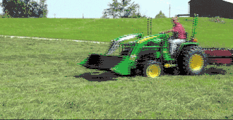 The original tedder is a farm tool on two wheels pulled by a horse; the rotation of the axle drives a gear which operates a "number of arms with wire tines or fingers at the lower ends."[9] The tines pick up the hay and disperse it; usually, the height at which the tines pick up the hay can be adjusted.
